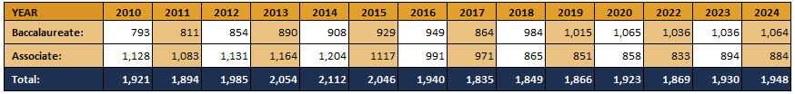 from 2023 to 2024 with baccalaureate programs producing 28 more RN graduates while associate degree nursing