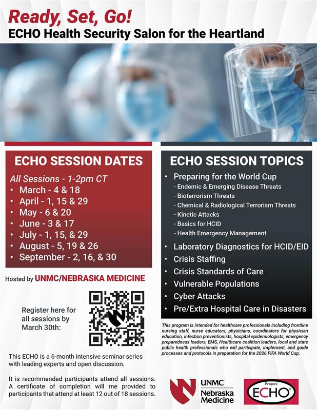 (March 6, 2026) – Register now for the free webinar series Ready, Set, Go! Health Security Salon for the Heartland. This six-month ECHO series is hosted by the Region 7 Regional Emerging Special Treatment Center at the University of Nebraska/Nebraska Medicine. Beginning at 1:00 p.m., each webinar offers an hour of education to enhance preparedness, response and community resilience ahead of the 2026 FIFA World Cup™ and beyond.
