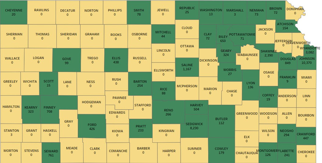 Source:Kansas Hospital Association Calendar Year 2025 Hospital Discharge Data supplemented with data from the 2024 AHA Survey. *Note: Numbers represent newborn discharges reported by hospitals within the county. No number (yellow counties) indicates no births reported or no community hospital in the county.