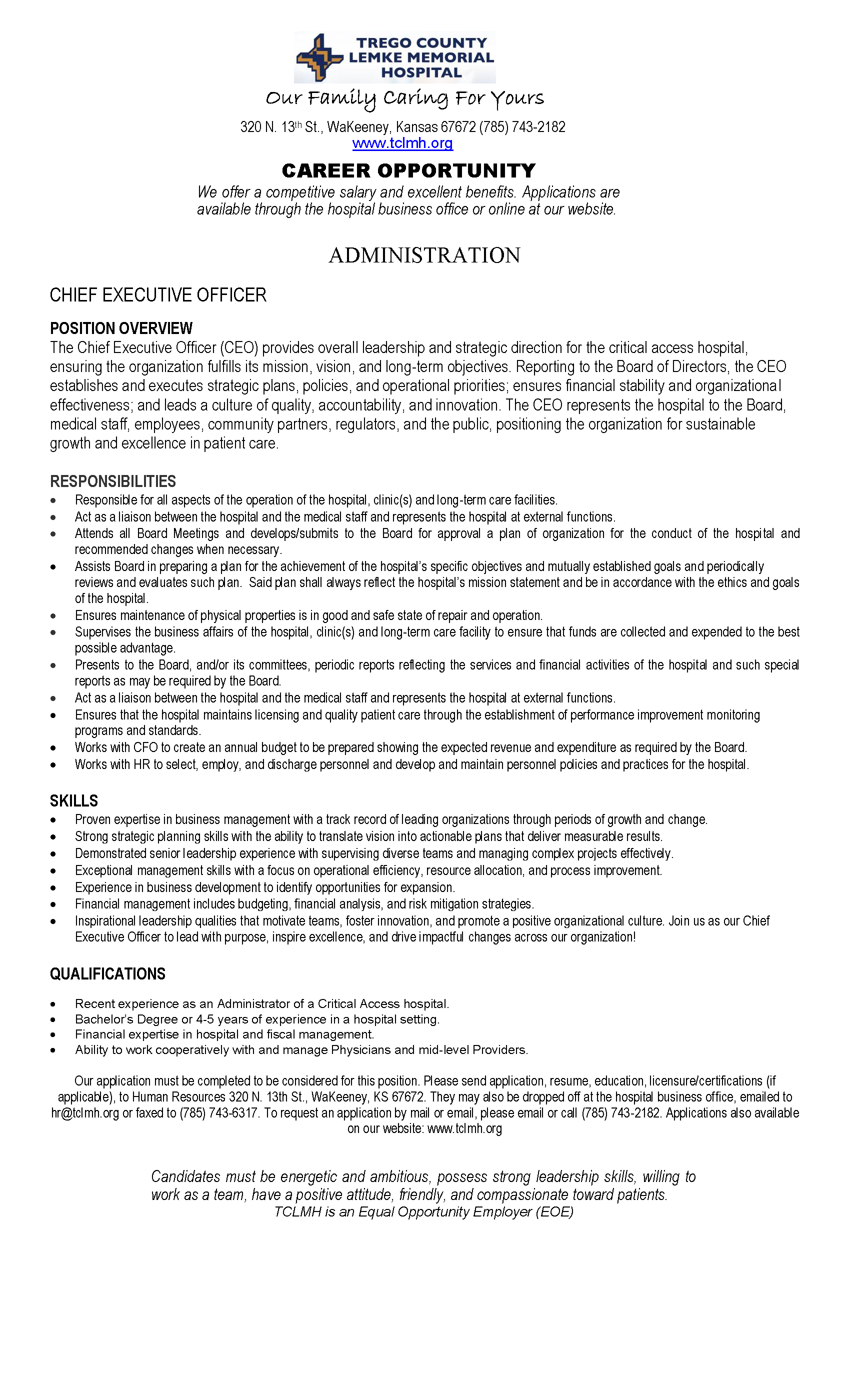 Trego County Lemke Memorial Hospital seeks an experienced and visionary chief executive officer to lead its Critical Access Hospital. Reporting directly to the board of directors, the CEO provides overall leadership and strategic direction to ensure the organization fulfills its mission, vision and long-term objectives.