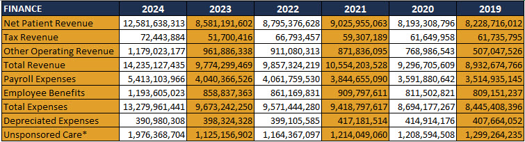 *Unsponsored Care = Bad debt + charity care. NOTE : Numbers may not add to totals because of rounding. Includes hospital-owned acute care and nursing home data.