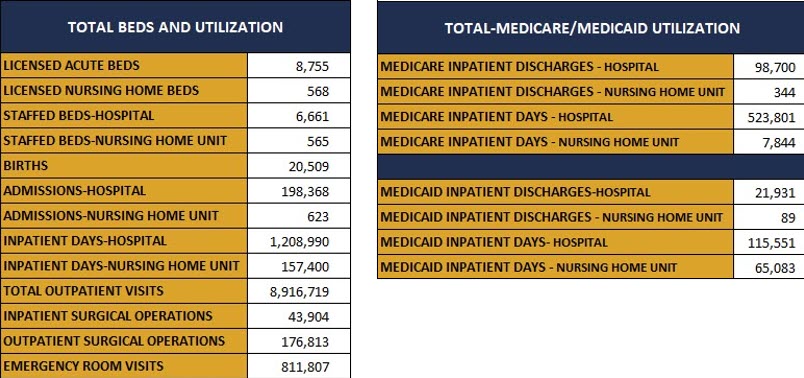 NOTE : Numbers may not add to totals because of rounding. Includes hospital-owned acute care and nursing home data. Beds are total for facilities,